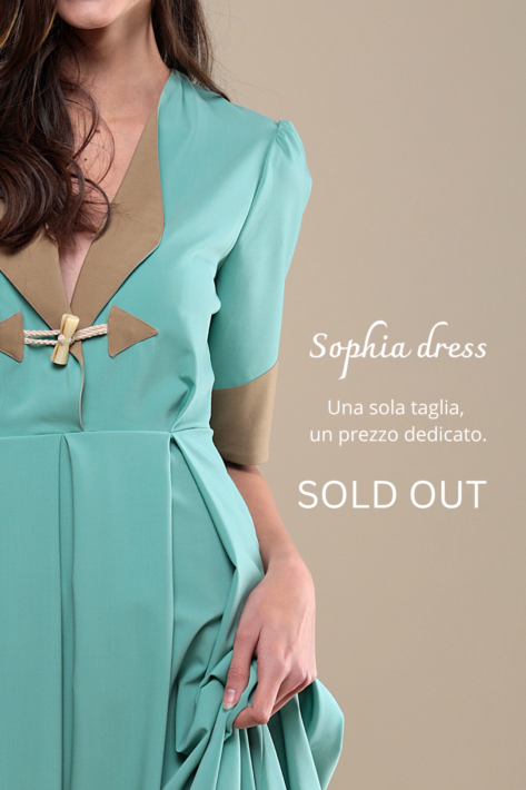 L’abito, un tubino dalle linee definite, modella e definisce elegantemente il corpo. Sulla schiena il vestito è impreziosito da piccoli bottoncini cuciti a mano; cade elegantemente appena sotto il ginocchio.